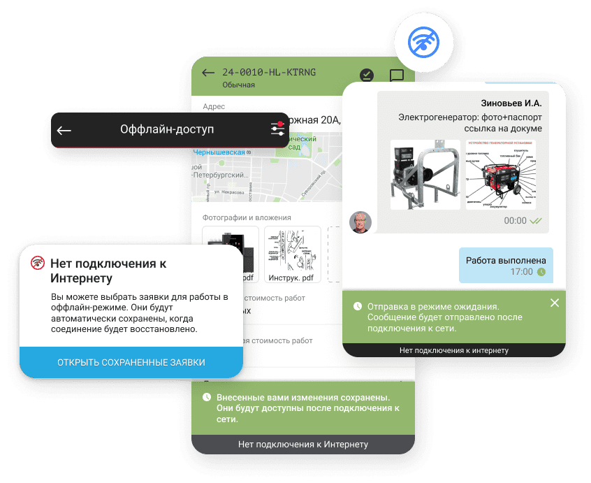 Приложение для Apple и Android смартфонов имеет множество функций и работает как при наличии интернета, так и офлайн – когда мобильный сотрудник находится вне сети. Причем в офлайн режиме исполнитель может не только смотреть заявки, но и заполнять мобильные формы, производить видеофиксацию, работать с чек-листами и заполнять отчеты. Как только доступ в интернет восстановится, все данные будут автоматически отправлены на сервер.